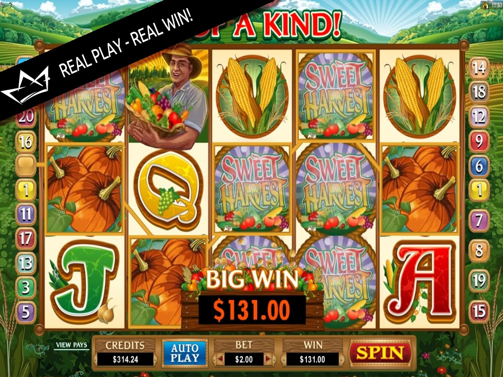 Bountiful harvests and exciting surprises are yours for the taking in Sweet Harvest! This 20-line slot is loaded with stacked WILDS, FREE Spins, SCATTER pays, colorful graphics, and an energetic soundtrack.